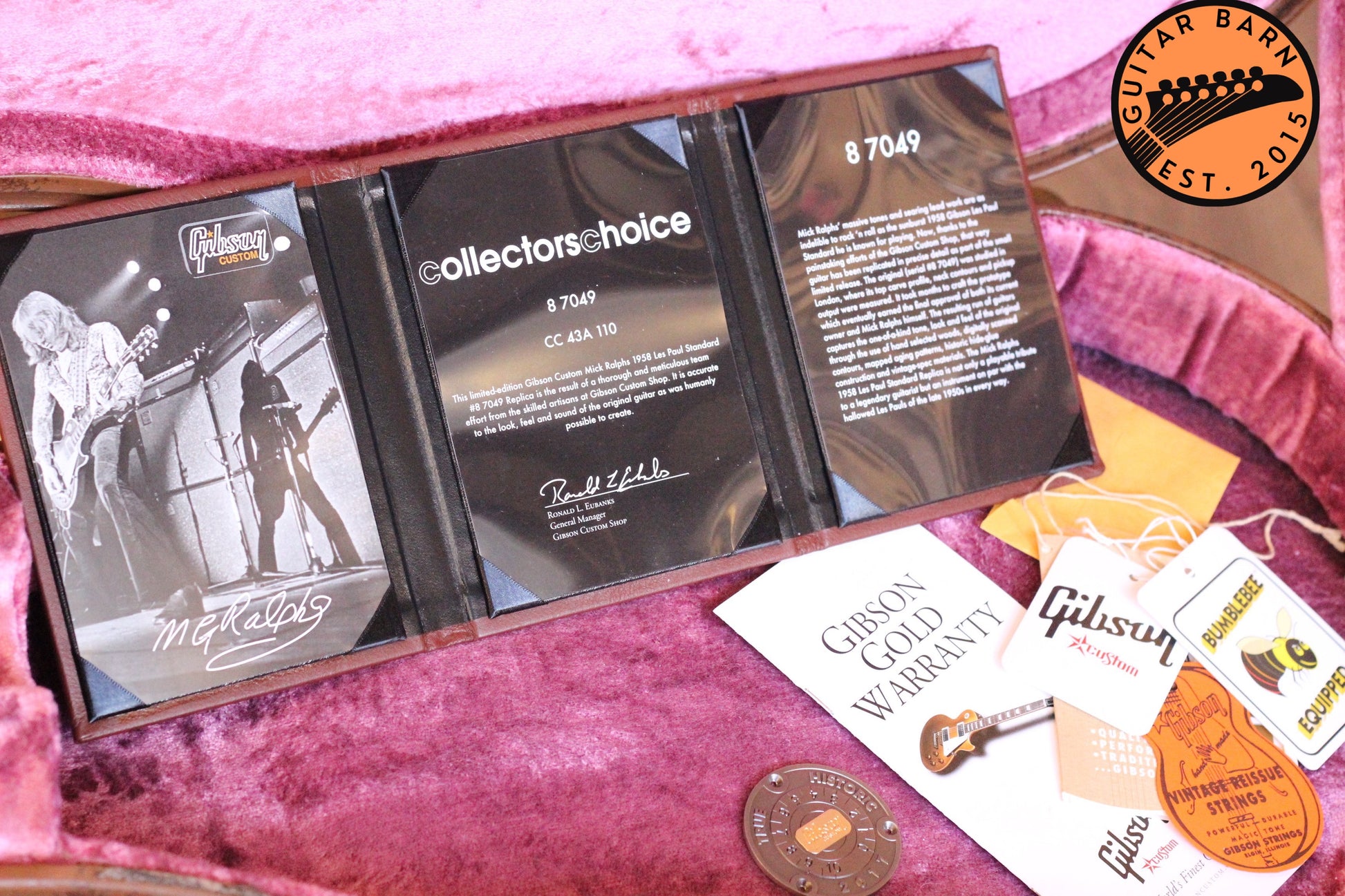Another stunning Gibson Les Paul Collector's Choice to come through Guitar Barn! This 'bad'ass model was painstakingly recreated from the original 1958 Les Paul owned by Mick Ralphs of Bad Company fame. It has a gorgeous light weight body, 2 piece flame maple top, '58 C shape mahogany neck, solid rosewood fingerboard, Custombucker pickups, aged case and certification/tags.