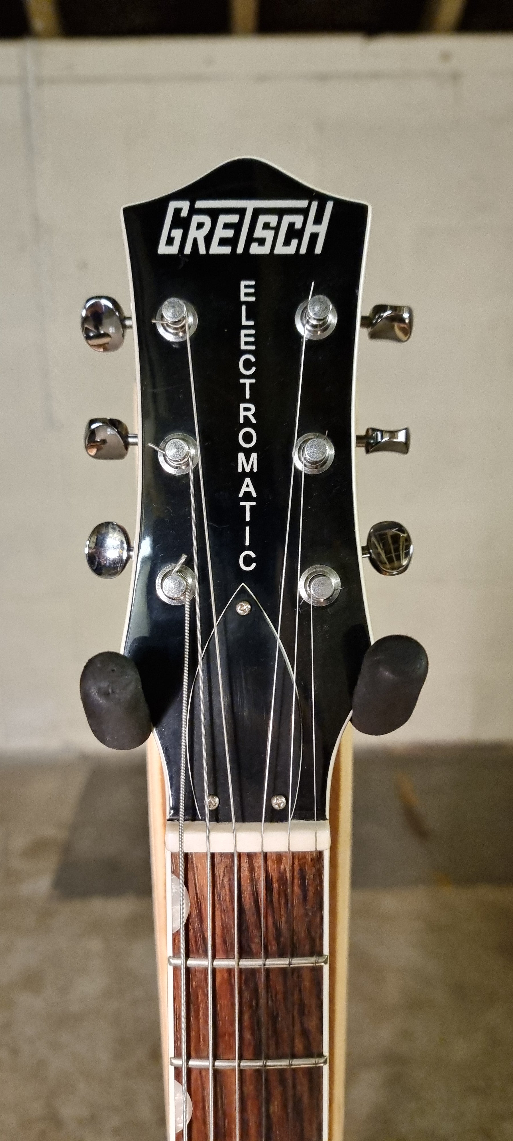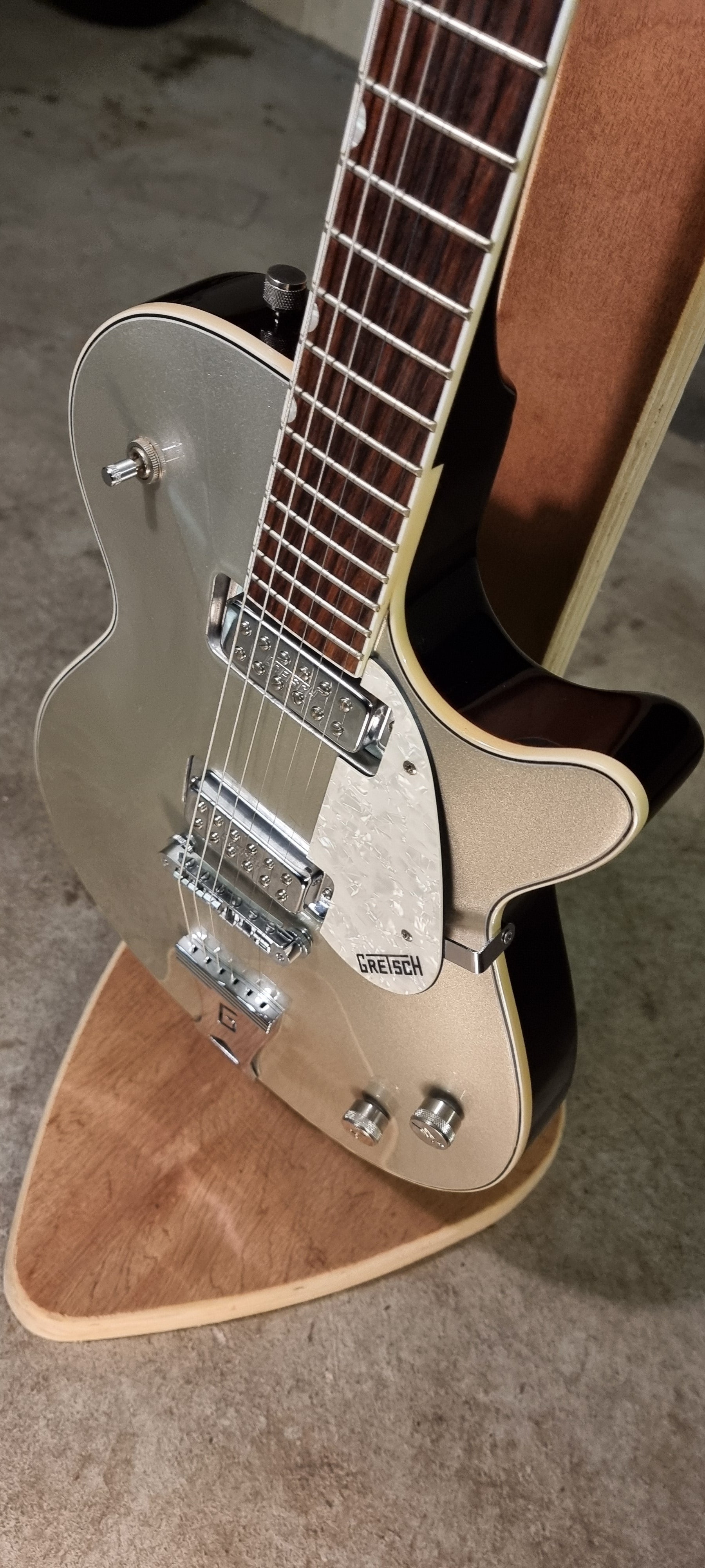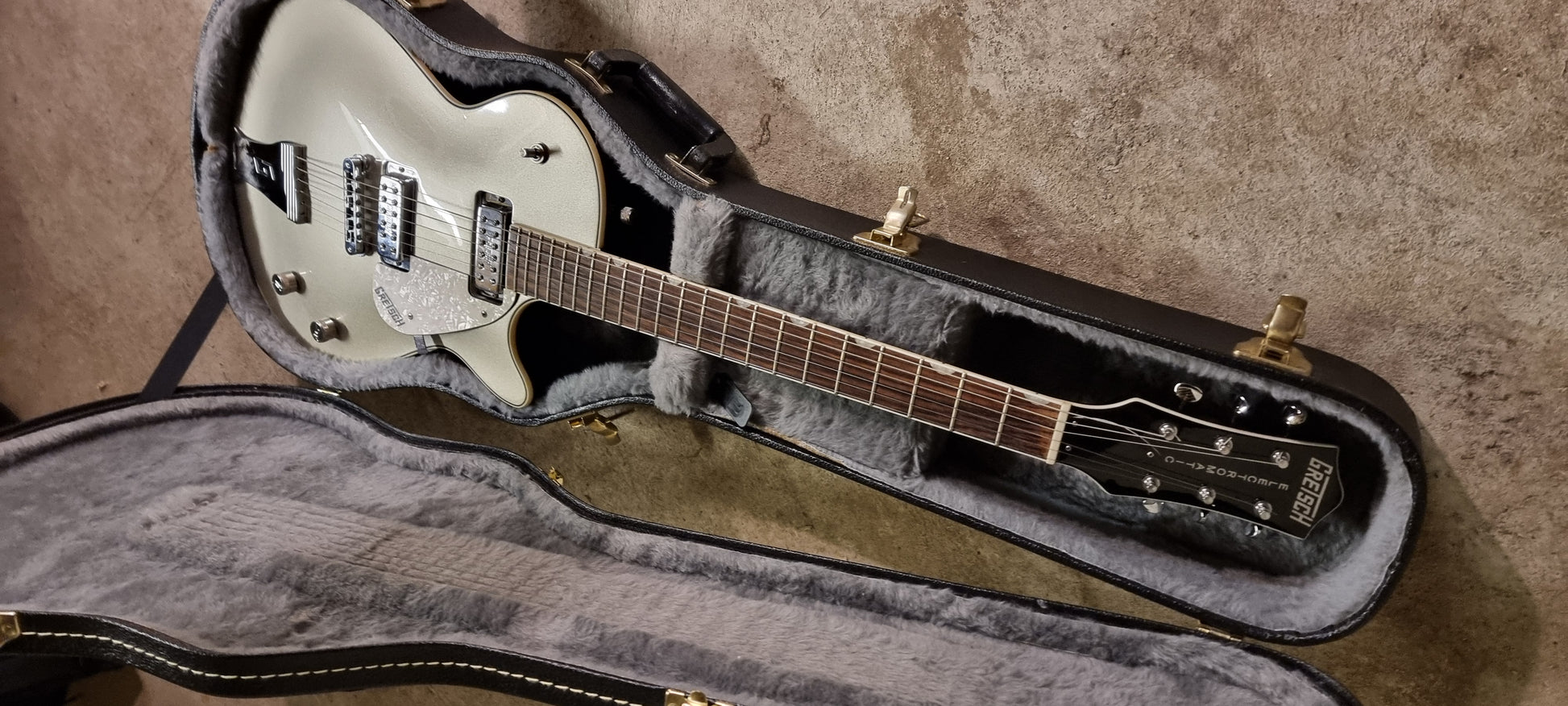Here we have a gorgeous Gretsch G5426 Jet Club Silver with added hard case. It's such a great guitar, which obviously takes insipration from another well known brand but altogether stands in it's own right. Single cut shape, double Gretsch humbuckers, this is an ideal guitar for rock.